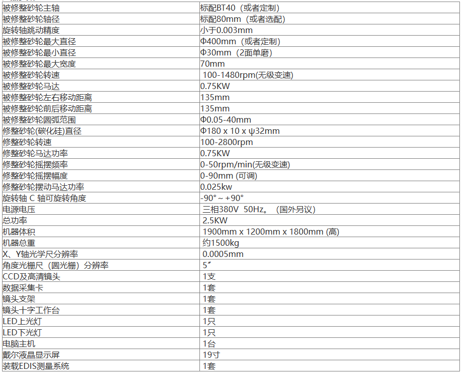 机床装载EDIS测量系统,液晶显示器。可以画出砂轮的图形,也可在线测量长度,圆弧,角度尺寸,还可以显微镜观察实物景象。CAD软件兼容,图形可以导入和导出。并且可以与C机床CCD摄影装置附有放大10到50倍镜头及19"液晶显示器,可以在工作中测量及检验砂轮之圆弧、角度及尺寸大小。CCD及光学尺寸装置提供了简易使用的设定及量测砂轮的宽度、位置以及于修整当中或修整之后的检验。测量精度可以达到0.005mm。修整砂轮手动进给,进给精度0.01mm。